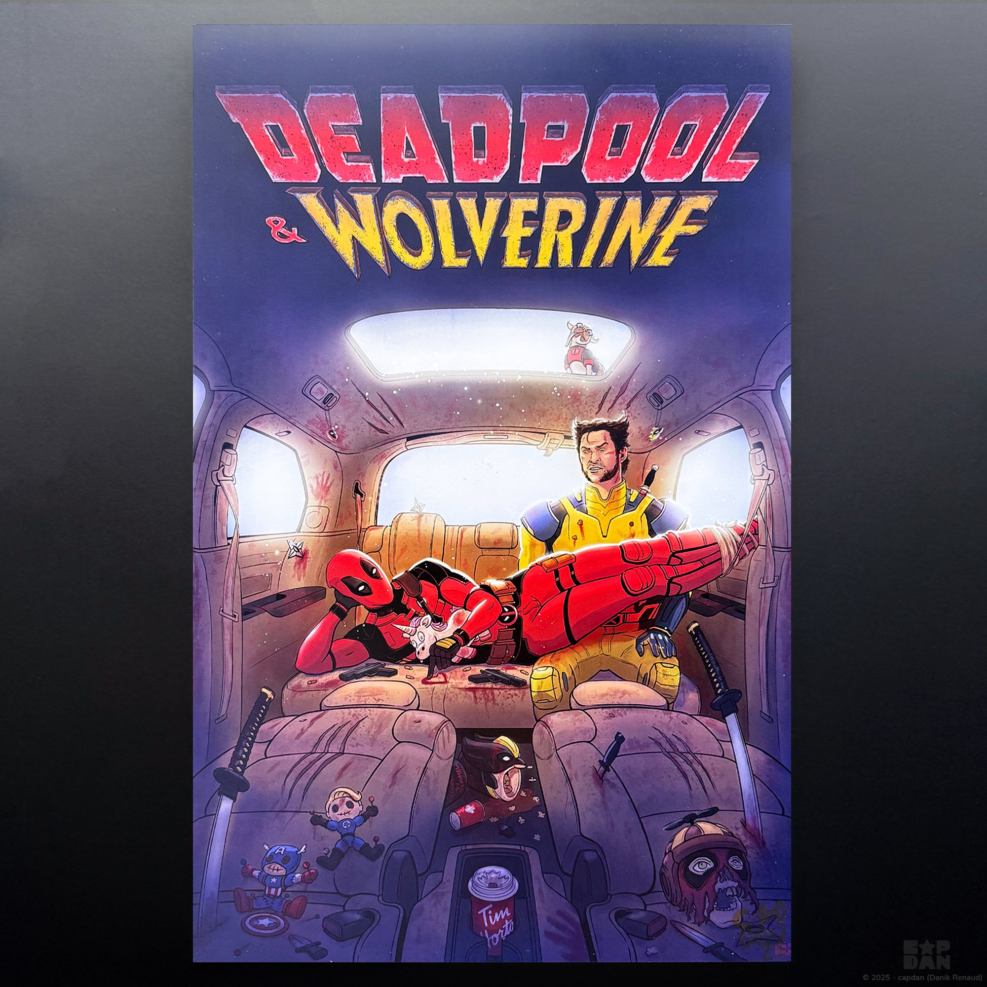 11x17" signed print of capdan's Deadpool & Wolverine illustration. Includes a bonus sticker and a signed note.