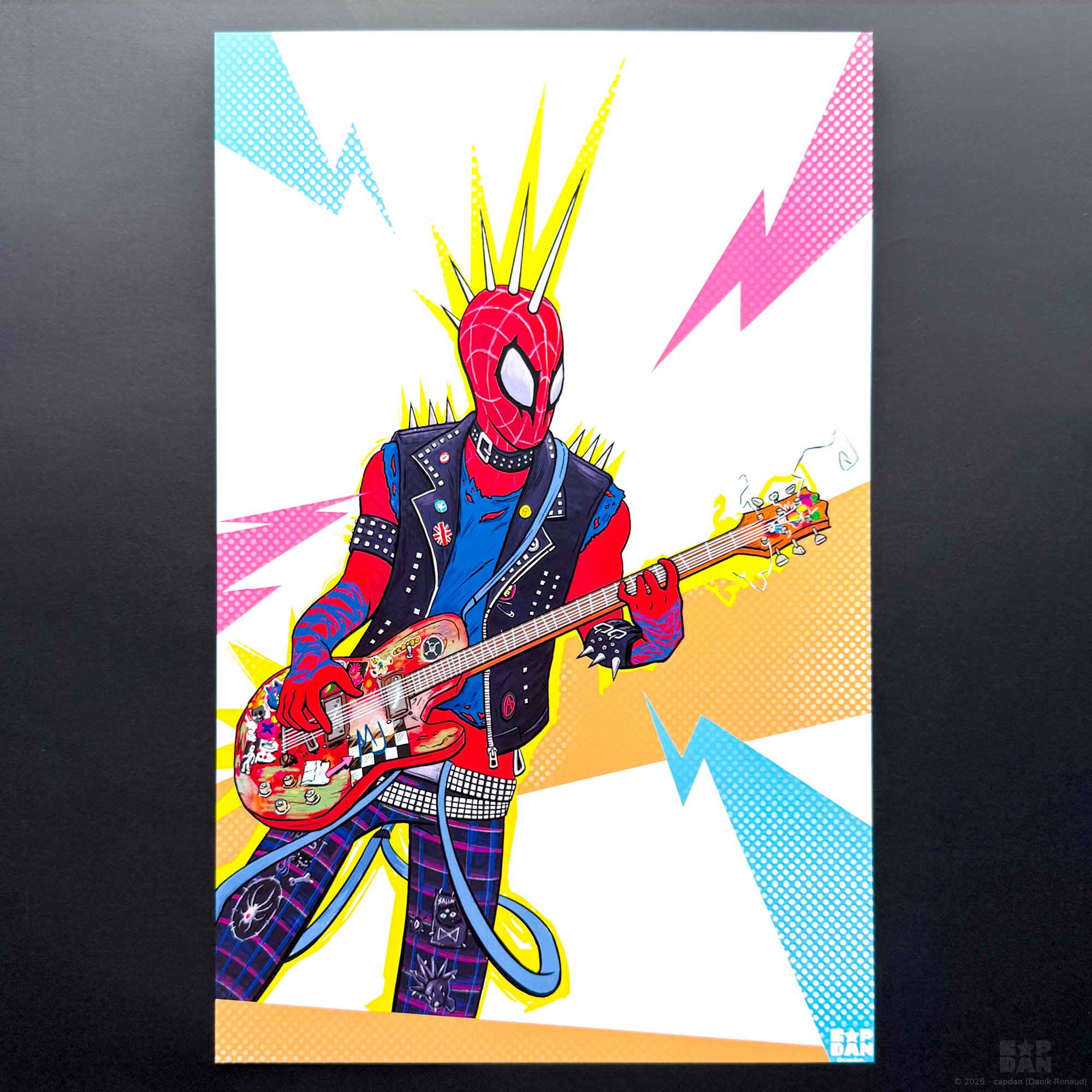 11x17" signed print of capdan's Spider-Punk illustration. Includes a bonus sticker and a signed note.
